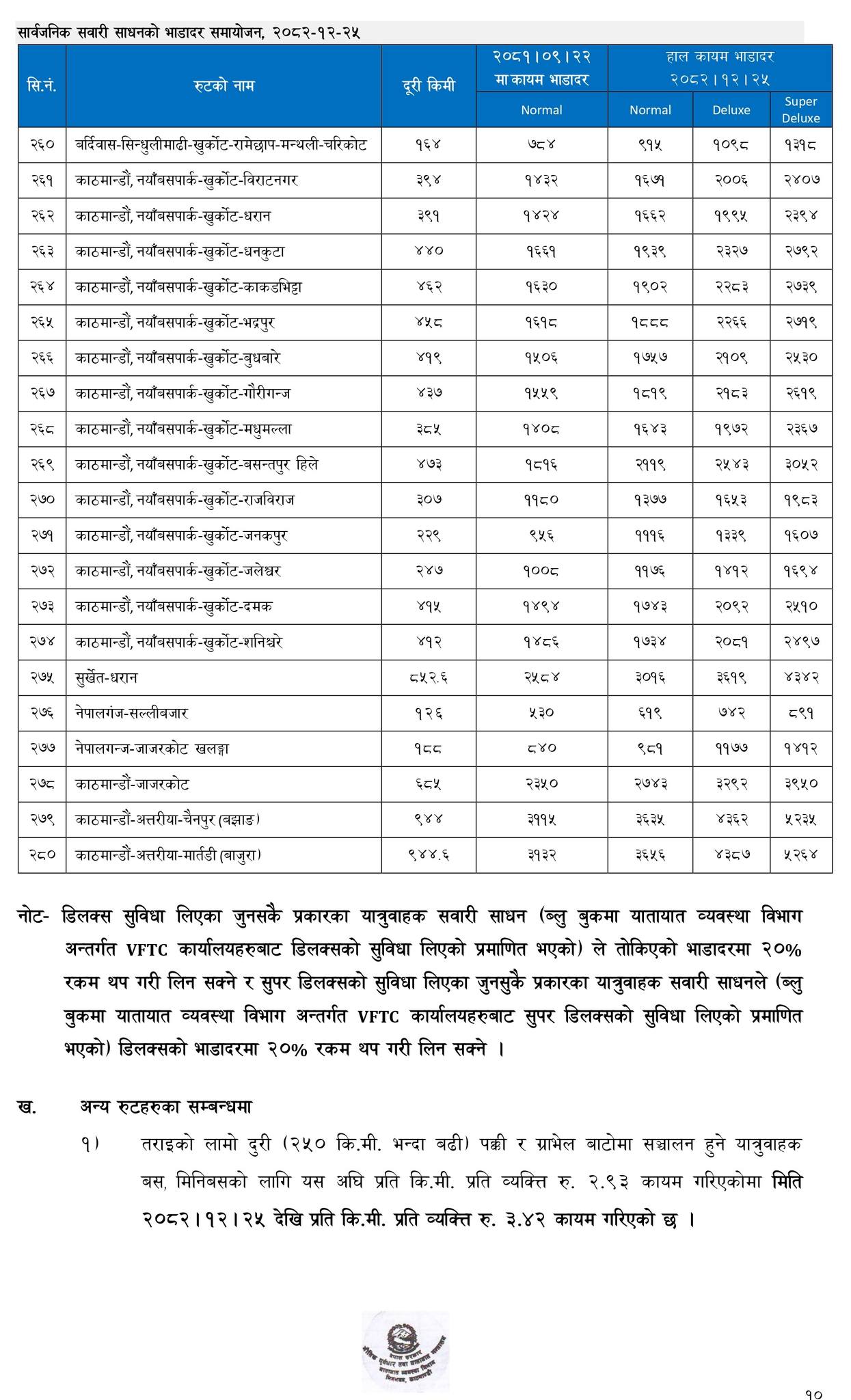 यातायात व्यवस्था विभागको सूचना अनुसार काठमाडौं–विराटनगर सुपर डिलक्स बसको भाडा रुपैयाँ २४०७, डिलक्स रुपैयाँ. २००६, सामान्य रुपैयाँ १६७१ कायम गरिएको छ । यस्तै, काठमाडौं– धनकुटा सुपर डिलक्स रुपैयाँ २७९२, डिलक्स रुपैयाँ २३२७, सामान्य रुपैयाँ १९३९, सामान्य (समान्य) रुपैयाँ १६६१ कायम गरिएको छ । डिलक्स सेवामा २०% थप भाडा र सुपर डिलक्स सेवामा डिलक्स भाडामा २०% थप भाडा लिन सकिनेछ, जुन ब्लु बुकबाट प्रमाणित हुनुपर्ने सूचना उल्लेख छ ।