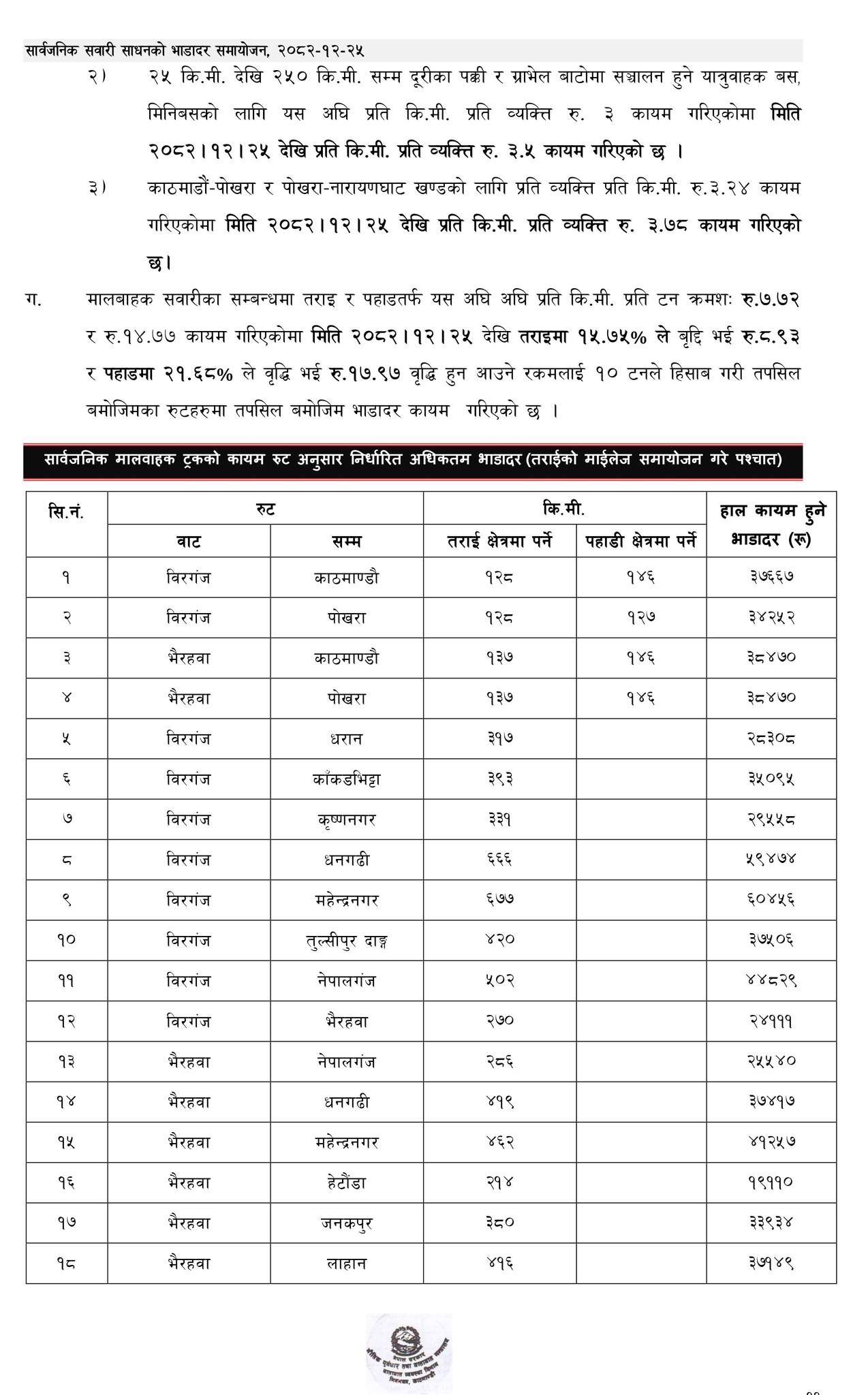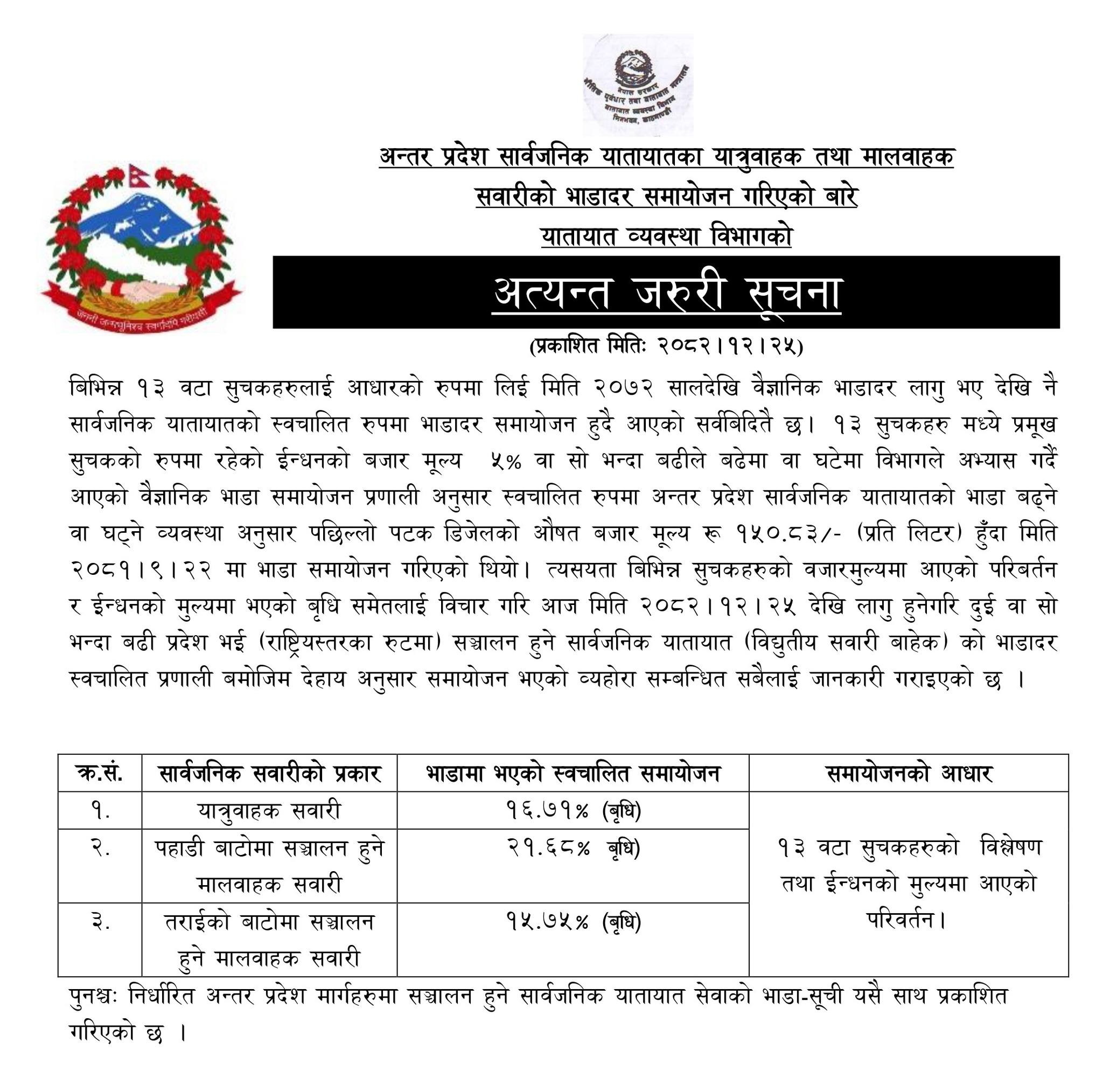चैत्र २५ गते डिजेल मूल्य तथा अन्य १३ वटा आर्थिक–सामाजिक सूचकको आधारमा यात्रुवाहक र मालवाहक सवारीको भाडा बढाइएको हो । समायोजन अनुसार, यात्रुवाहक सवारीको भाडा १६.७१ प्रतिशत, पहाडी मालवाहक सवारीको भाडा २१.६८ प्रतिशत, र तराई मार्ग मालवाहक सवारीको भाडा १५.७५ प्रतिशतले वृद्धि भएको छ ।