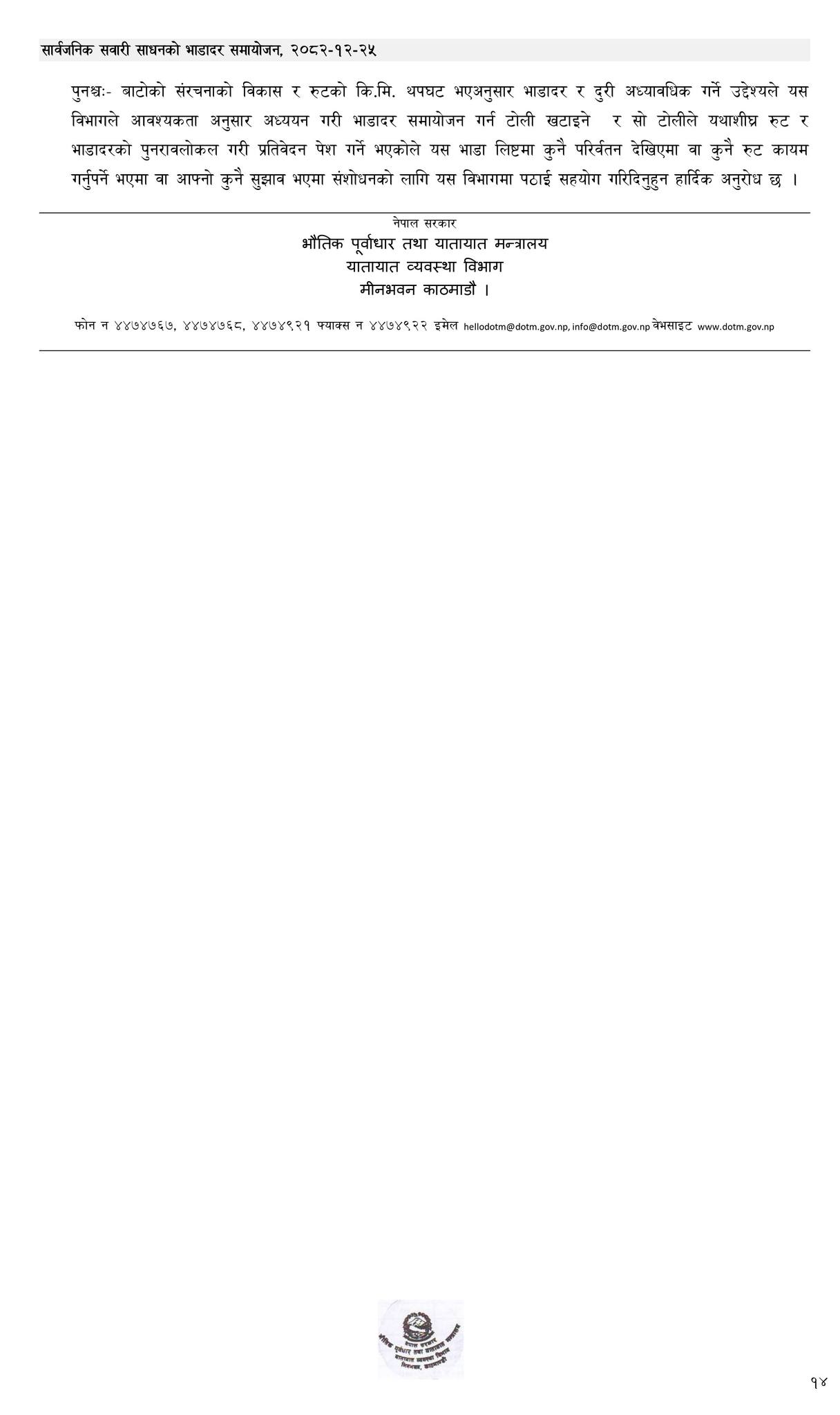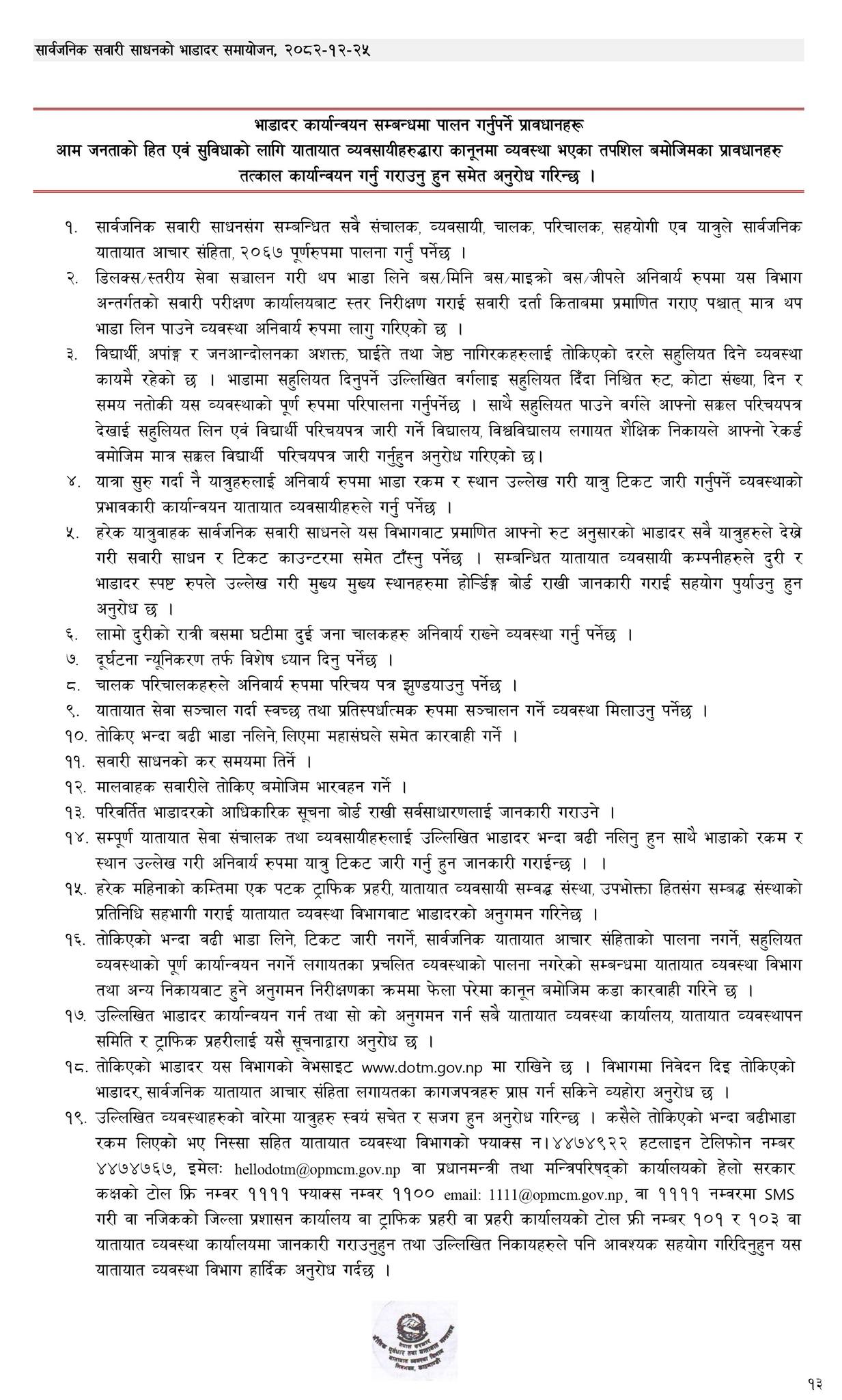 भाडा सूची तथा थप जानकारी विभागको वेबसाइटमा उपलब्ध हुनेछ । साथै, भाडा बढाबढ वा अन्य गुनासोका लागि नागरिकले हेलो सरकार ११११, ट्राफिक प्रहरी १०१/१०३ वा नजिकको यातायात कार्यालयमा सम्पर्क गर्न सक्नेछन् ।