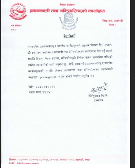 कार्यालयले जारी गरेको सूचनामा सम्पत्ति विवरण कार्यालयको आधिकारिक वेबसाइट www.opmcm.gov.np मार्फत हेर्न सकिने व्यवस्था गरिएको जनाएको छ।