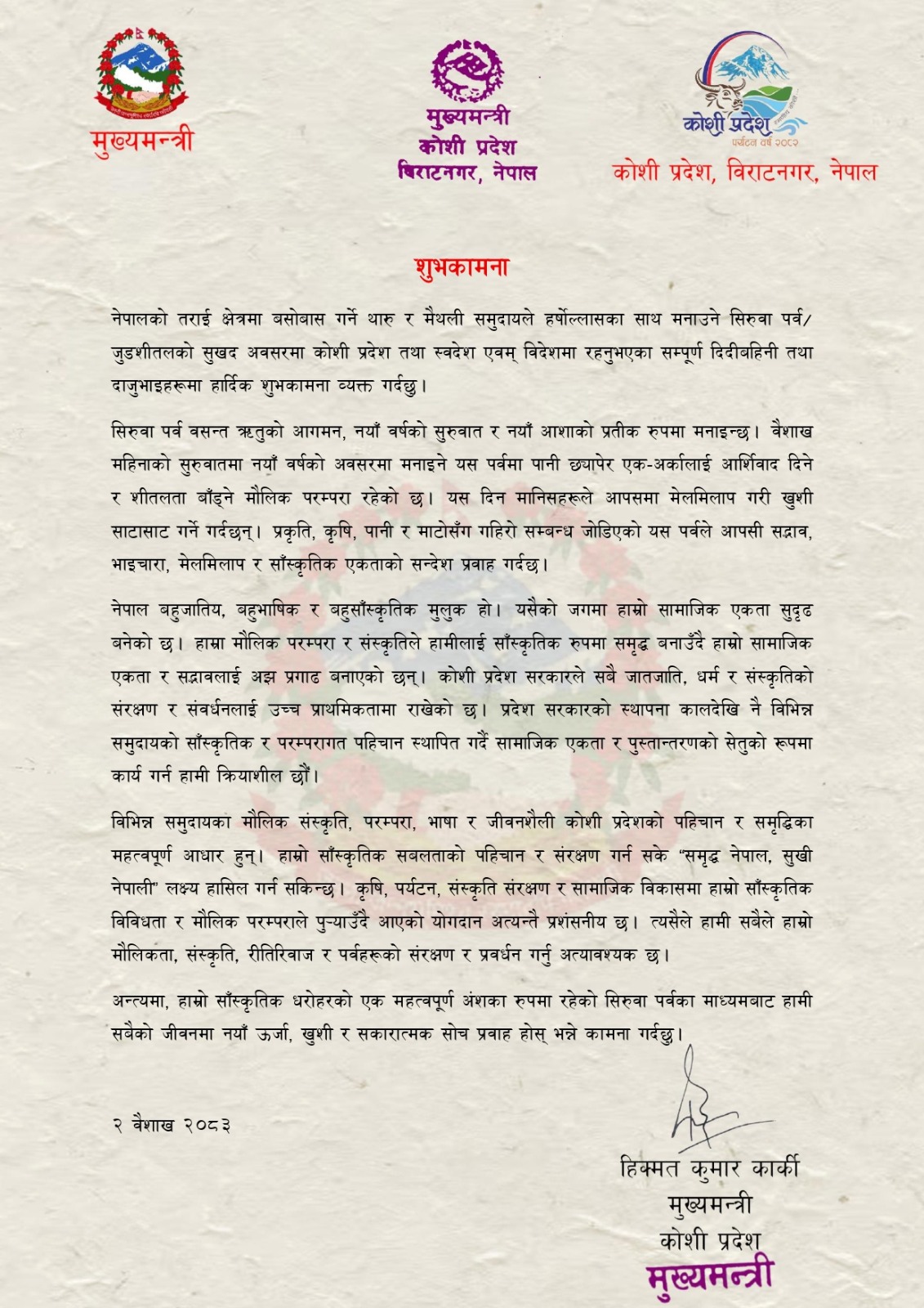 यसैबीच, कोशी प्रदेश सरकारले वैशाख २ गते बुधबार सार्वजनिक बिदा घोषणा गरेको छ। सरकारी कार्यालय, शैक्षिक संस्था र विभिन्न निकायहरू बन्द रहे पनि गाउँ–बस्तीहरू भने उत्सवमा रमाएका छन्।