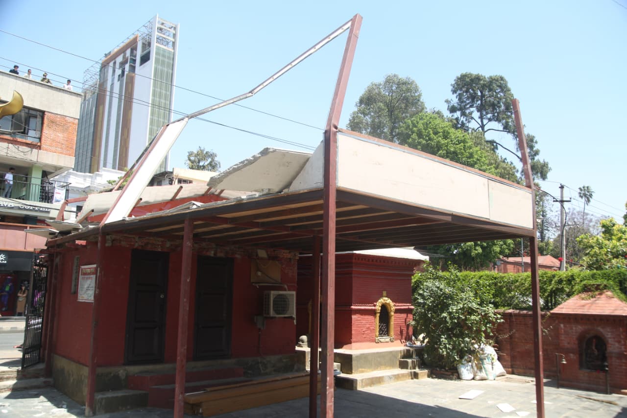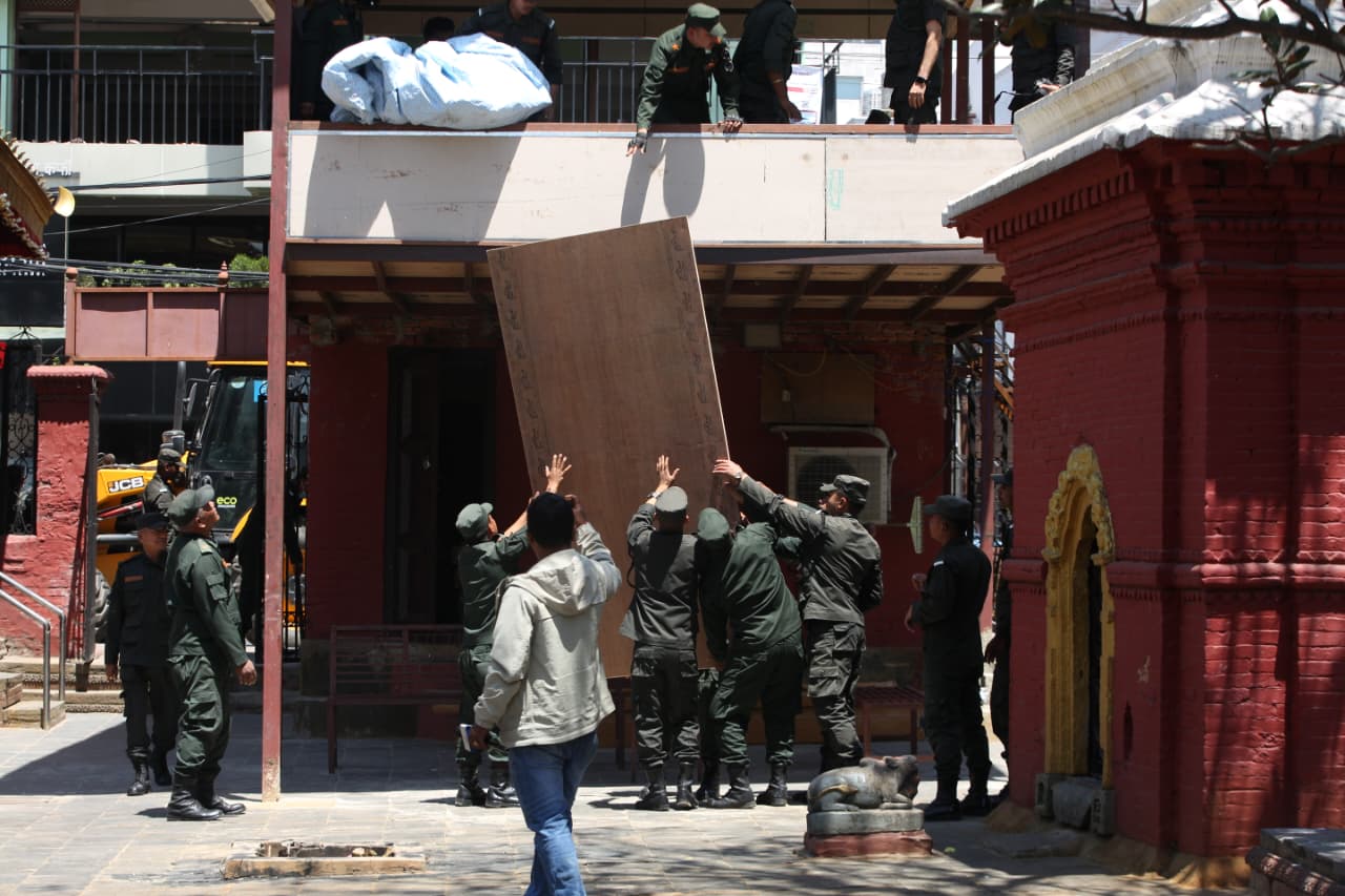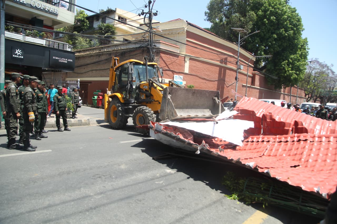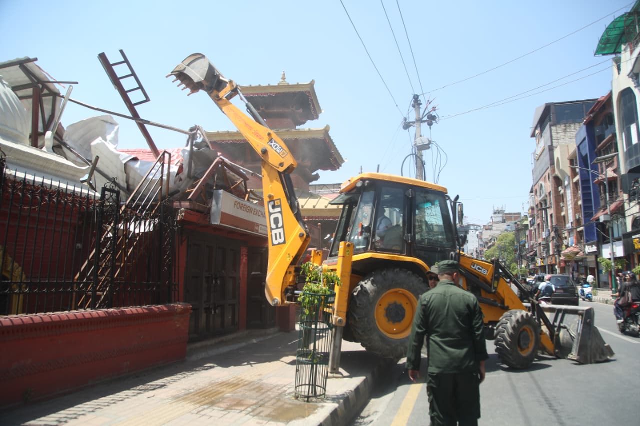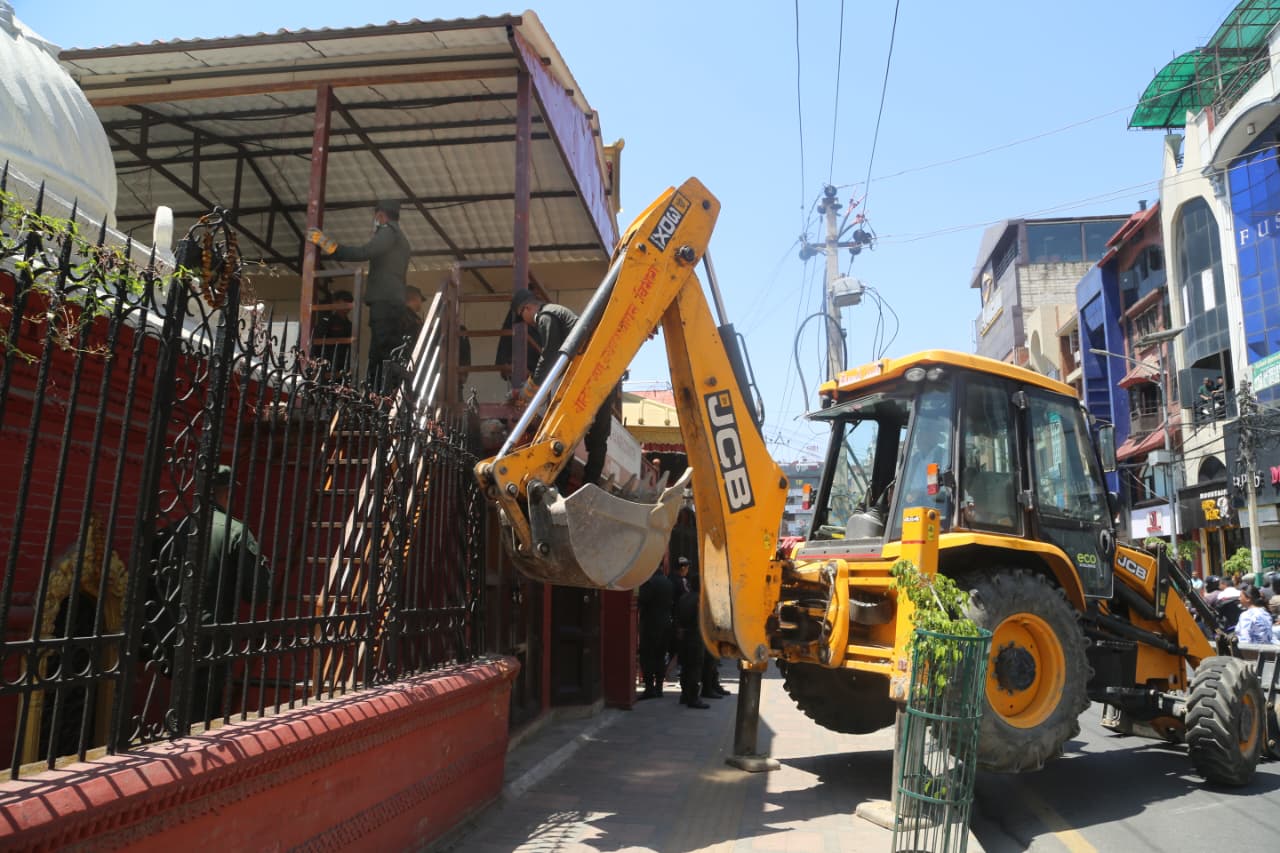 काठमाडाैं महानगरले चलायाे त्रिदेवी मन्दिरमा बनेको अनाधिकृत संरचनामा डाेजर (तस्विर)