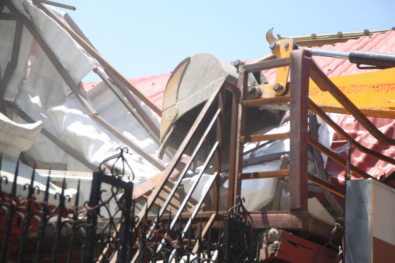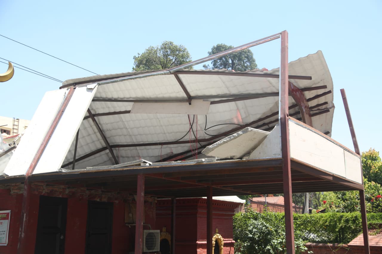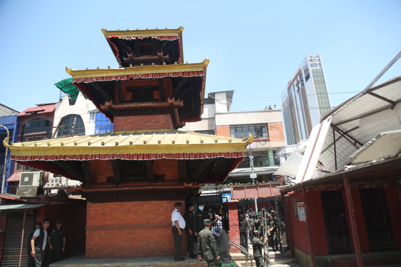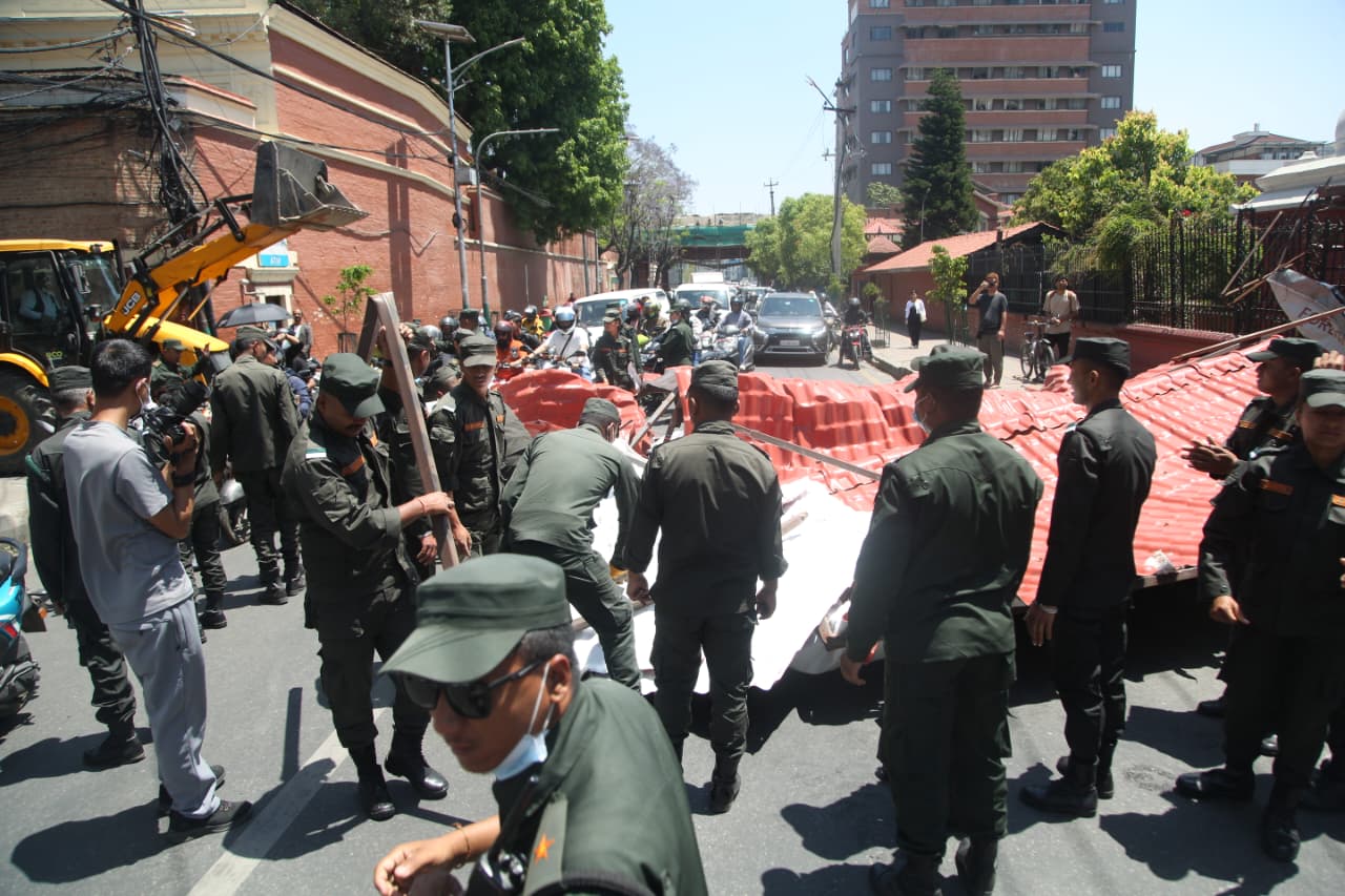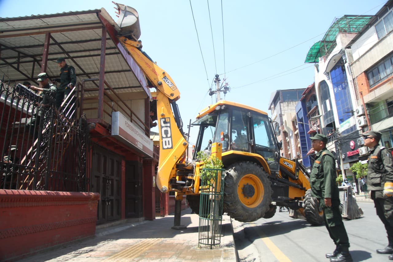 काठमाडाैं महानगरले चलायाे त्रिदेवी मन्दिरमा बनेको अनाधिकृत संरचनामा डाेजर (तस्विर)