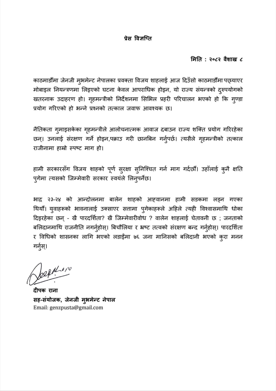 विज्ञप्तिमा काठमाडौंमा आज दिउँसो विजय शाहलाई पछ्याएर मोबाइल नियन्त्रणमा लिइएको घटना केवल आपराधिक नभई राज्य शक्ति दुरुपयोगको संकेत भएको उल्लेख गरिएको छ।