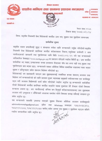 सङ्घीय मामिला तथा सामान्य प्रशासन मन्त्रालयले सोमबार एक सूचना जारी गरी विधेयकको प्रारम्भिक मस्यौदामाथि राय, सुझाव प्राप्त भइरहेको जानकारी गराएको हो ।
