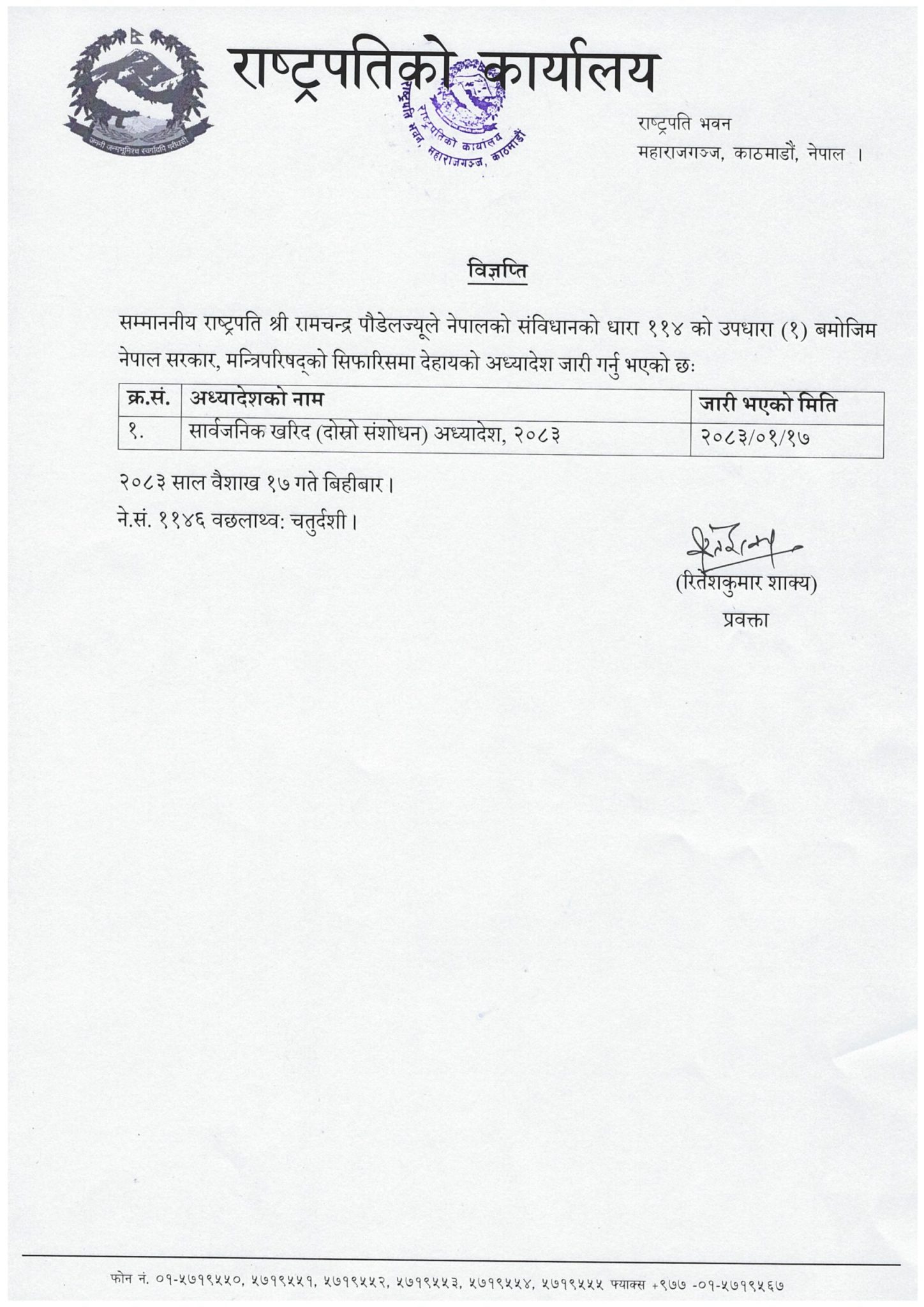 काठमाडौं। राष्ट्रपति रामचन्द्र पौडेलले मुलुकको विकास निर्माण र सार्वजनिक खरिद प्रक्रियालाई थप व्यवस्थित एवं प्रभावकारी बनाउने उद्देश्यले ‘सार्वजनिक खरिद (दोस्रो संशोधन) अध्यादेश, २०८३’ जारी गरेका छन्।